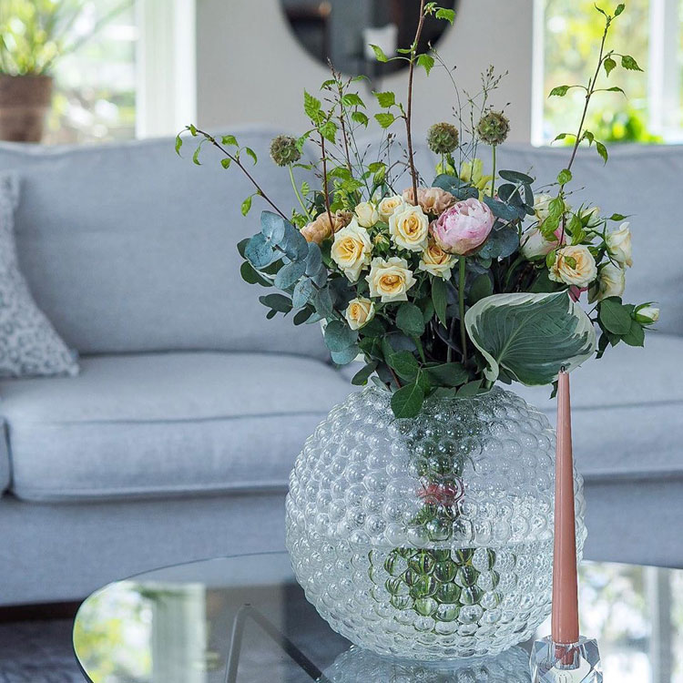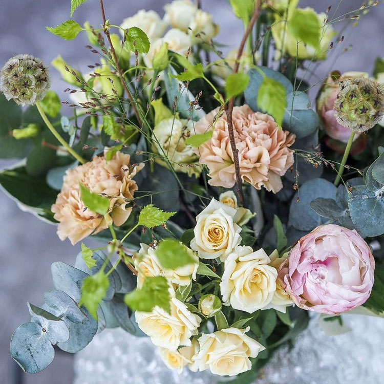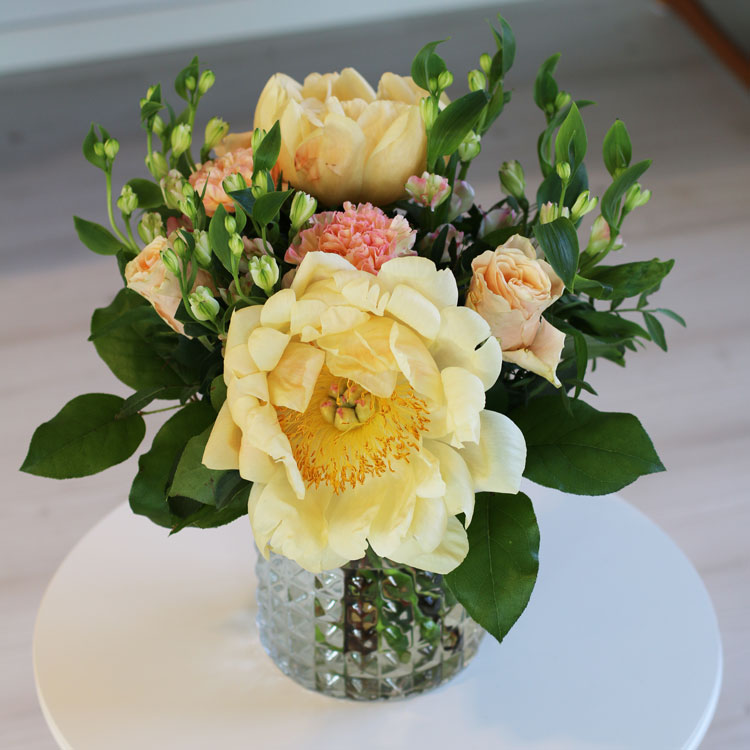 Hemma hos Emma Jönsson hittar vi denna spirande försommarbukett med bland annat kvistrosor, pioner, nejlika, hosta, eukalyptus och scabiosa.