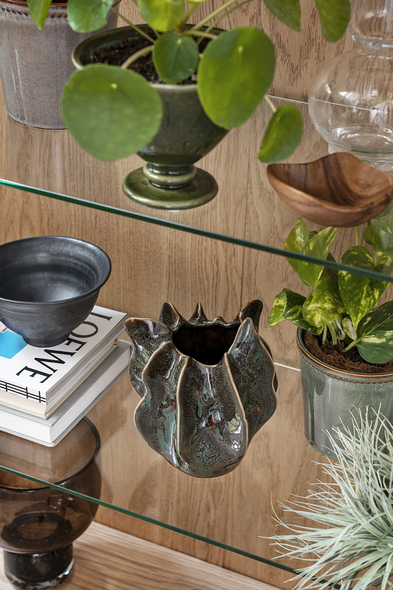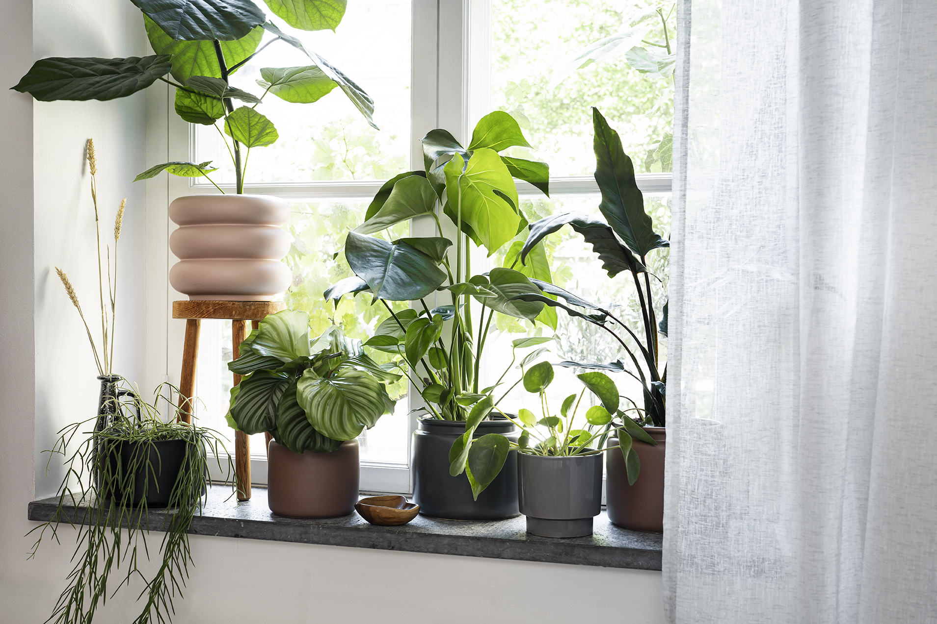 Fiolfikus är en annan favorit som med tiden kan bli upp emot två meter. Den är fin i en stor korg på golvet i närheten av fönstret, där den får ljus men inte riskerar att brännas av solen. Längre in, i en skål eller ett fat på soffbordet, trivs den spännande och originella luftplantan. Den vill varken stå i jord eller kruka, utan känna sig fri som den är van att göra högt upp i grenverket i Amazonas regnskogar. I stället för att vattna sprejar du den, samla regnvatten om du vill skämma bort den. Den gillar också att ta ett bad. Och få frisk luft. Man kan relatera, eller hur? Mycket charm väntar – luftplantan är enkel att tycka om och drar garanterat nyfikna blickar till sig när du har gäster på besök.