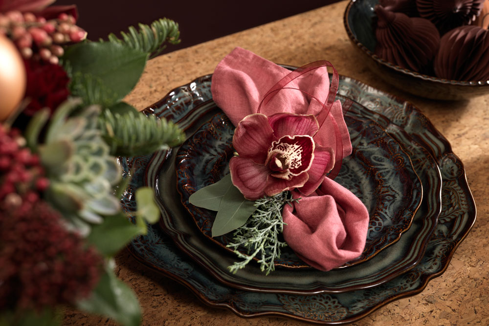 För att få till den trendiga stilen har vi här dukat på både höjden och bredden. Bakom bordet står en Lyxplantering med orkidé, som är en trendig julplantering i rosa och röda färgtoner.