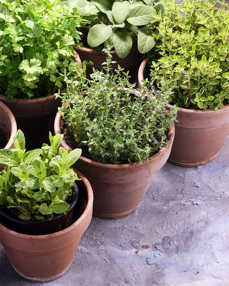 Prydnadsgräs, lavendel, murgröna, alunrot,uppstammad myrten och palettblad är fina ihop med örter som basilika, rosmarin och salvia.